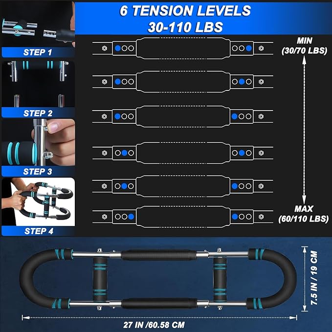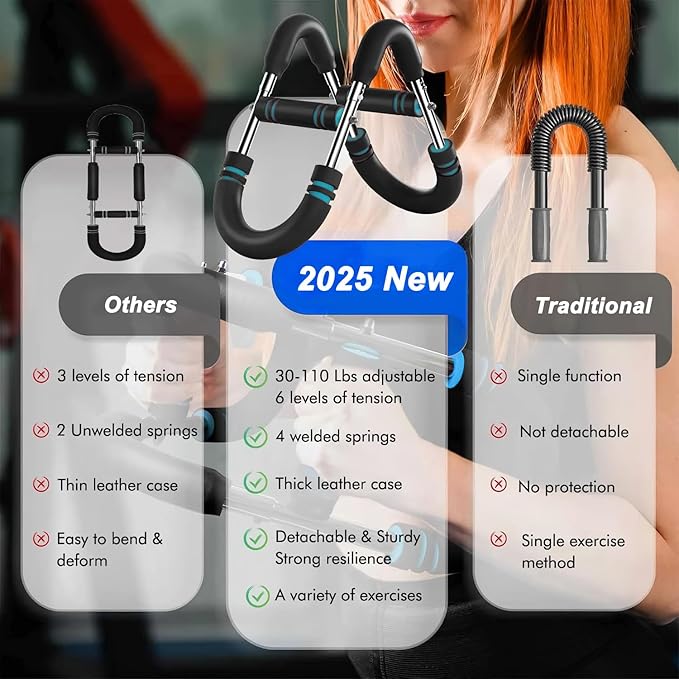 - ✅【2025 Upgraded Twister Arm Trainer】: The 2025 upgraded twister arm trainer features thickened sleeves, 6-level resistance (30-110 lbs), and welded springs for durability. Includes 2 sets (4 springs) for versatile workouts—from rehab to advanced muscle toning. Perfect as twister arm trainer for men/women, home chest workout equipment, and home workout equipment.