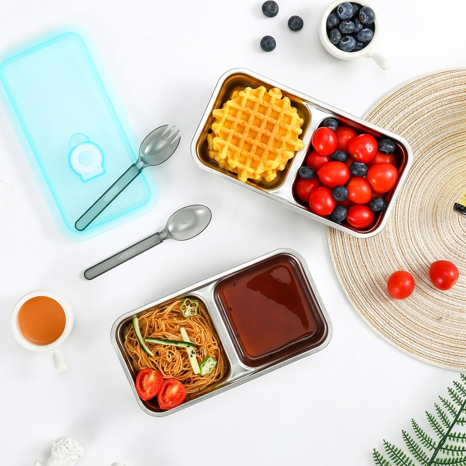 304 Stainless Steel Bento Boxes with Lids, 2pcs Leakproof Double Compartment Snack Containers, Reusable Food Storage Containers for Lunch, Travel & Camping