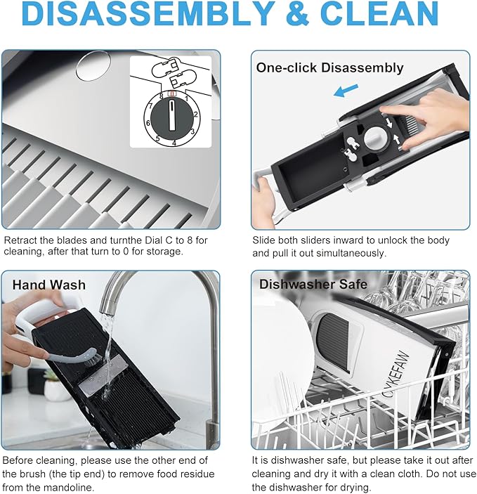 - Read the manual carefully: Please read the instruction manual of the OYKEFAW vegetable chopper closely before use. If you have any questions or issues regarding the Mandolin please do not hesitate to send the seller a message through Amazon and we will respond within 24 hours.