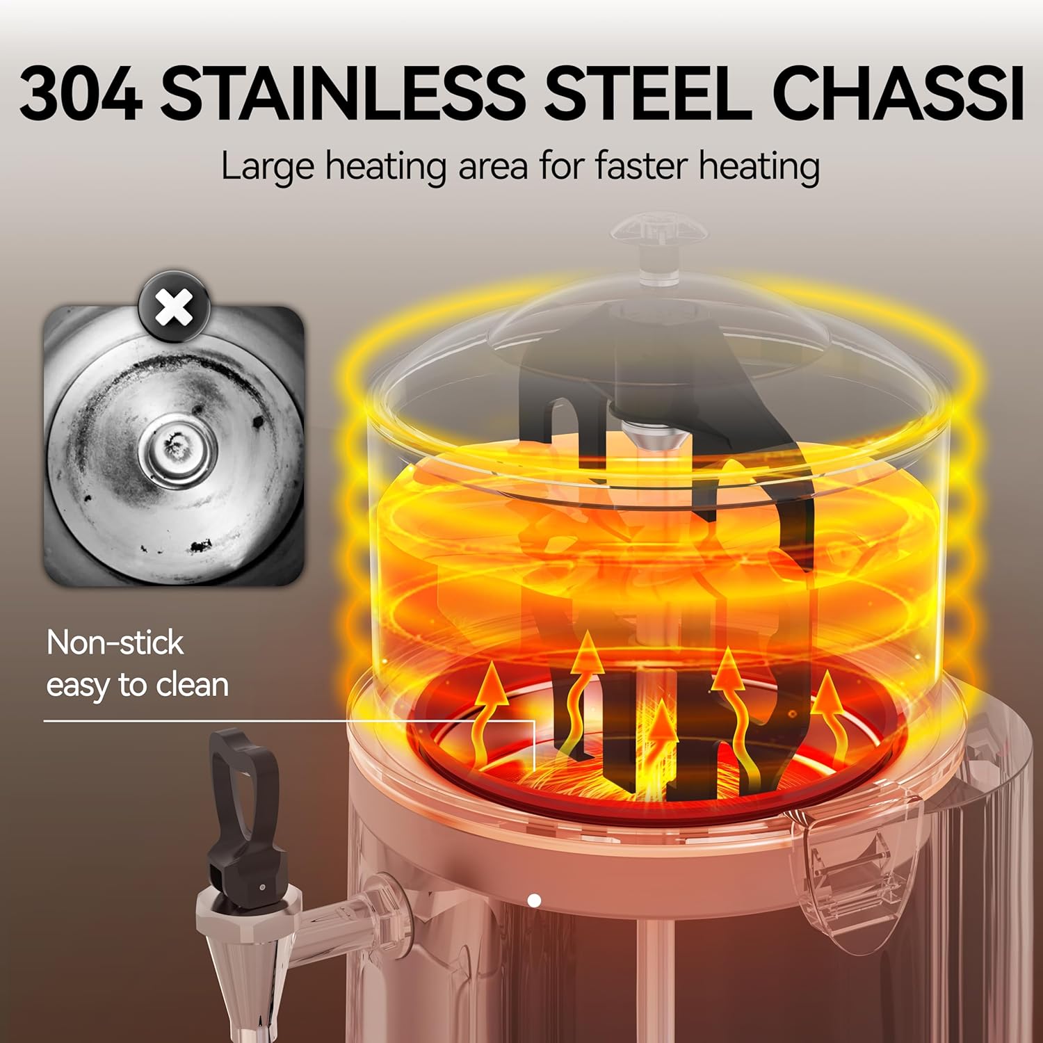 - 【Material assured】 The faucet is made of 304 stainless steel, which is not easy to rust; PVC food-grade mixing leaves and transparent cylinder guard your drinking health. Stainless steel heating plate, anti-scorch and anti-stick, easy to clean