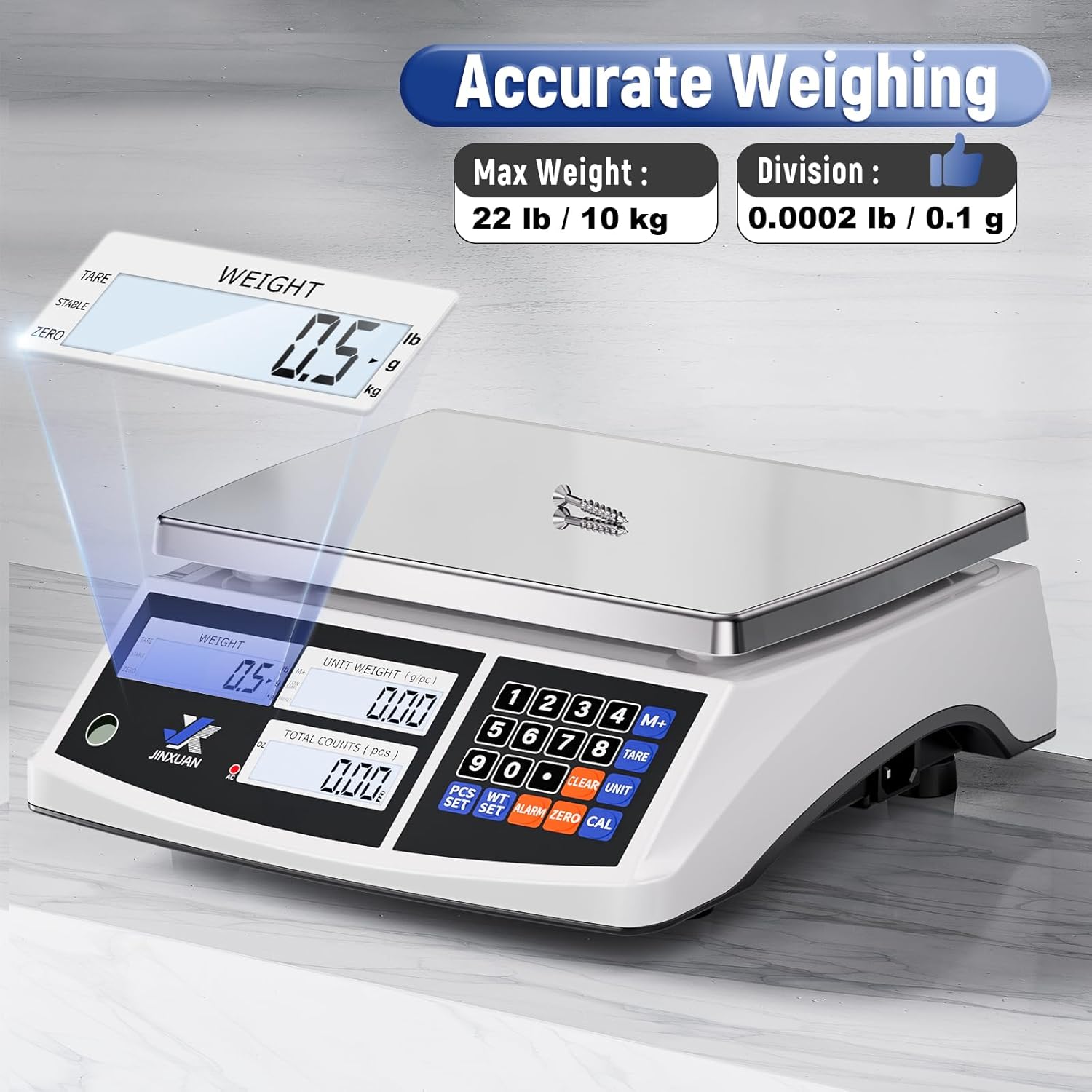 - đăPrecise Counting Scale ăJINXUAN counting scale features a high-precision weighing sensor with an accuracy of 0.1 g/0.0002 lb. Its built-in level bubble and adjustable leveling feet can ensure stable and accurate measurements