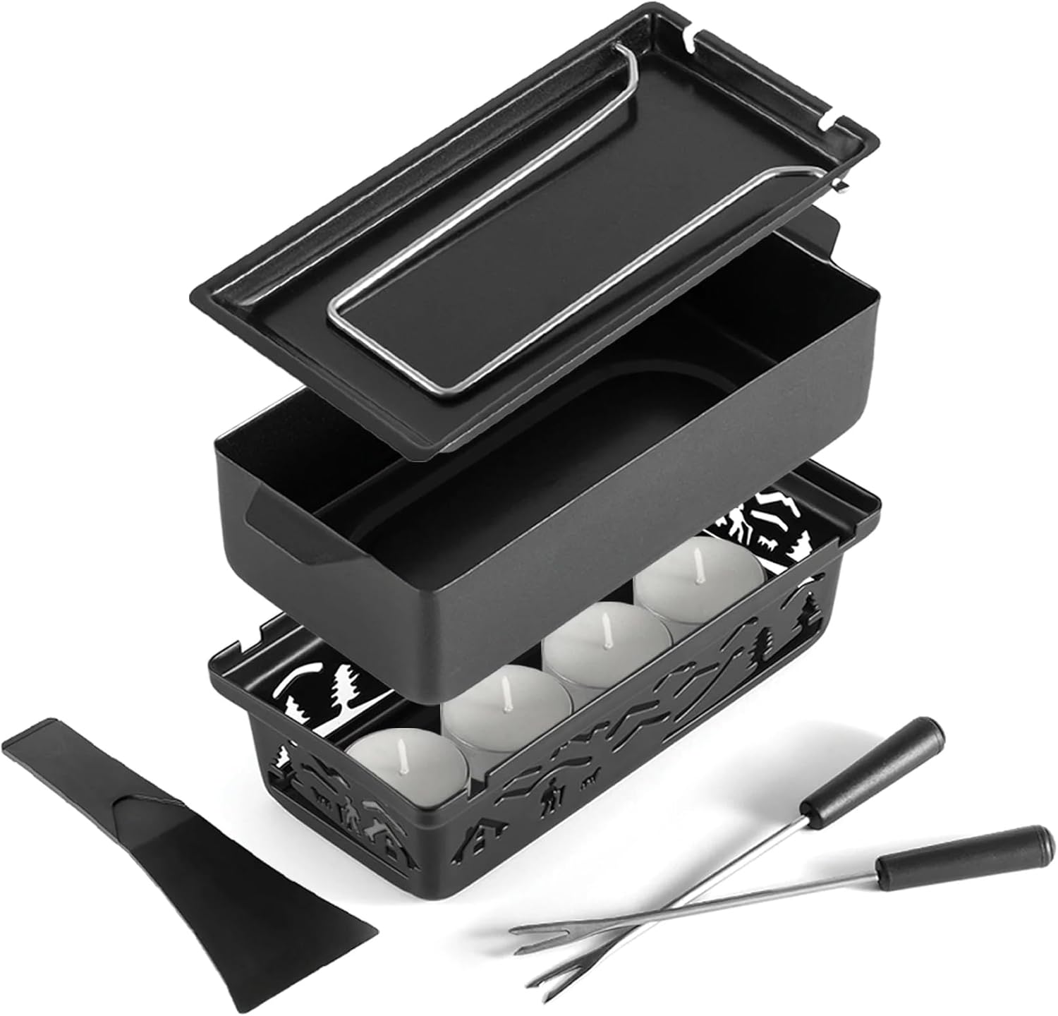 - Complete Serving Kit Included – Comes with everything you need: base stand, fondue pot, raclette dish, raclette spatula, 2 fondue forks, and 4 tealight candles.