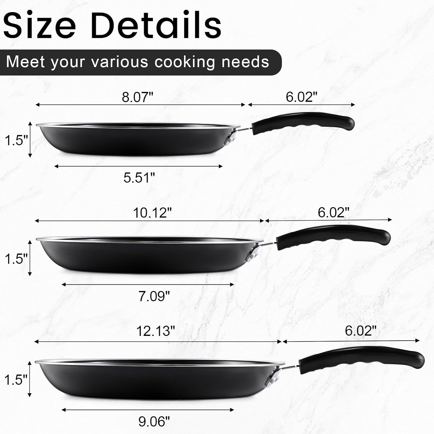 - 【Complete Set with Bonus Tools】Upgrade your kitchen with our ultimate pans set nonstick! This frying pan set includes three versatile sizes (7.9", 10.2", 11.8") perfect for different cooking task. From sunny-side-up eggs in the small skillet to family-sized salmon fillets in the large pan. We even include two complimentary spatulas! No more struggling with mismatched cookware or searching for tools mid-recipe