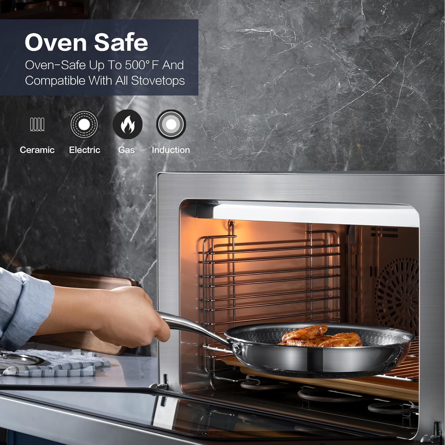 - 【Revolutionize Your Cooking】: Elevate your culinary experience with the mixed-material non-stick set. Featuring a unique three-layer structure. It combines a stainless steel outer layer with an aluminum core for even heat distribution and lasting durability. The laser-etched surface blends stainless steel’s frying power with the non-stick material’s effortless food release. It makes every cooking moment a delight.