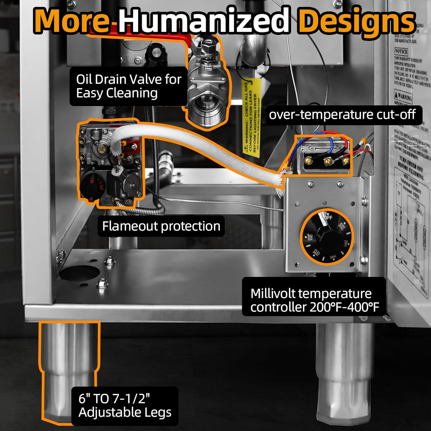 - Industrial Safety & Precision Control:Engineered with CSA-certified safety, this liquefied gas fryer features behind-the-door millivolt control for intuitive temperature adjustments (200°F–400°F). Over-temperature protection automatically cuts off gas at 450°F (232°C), exceeding commercial safety standards. Reinforced 430 stainless steel construction resists corrosion, while flame failure protection prevents hazards. Four adjustable stainless steel legs stabilize on uneven food truck terrain