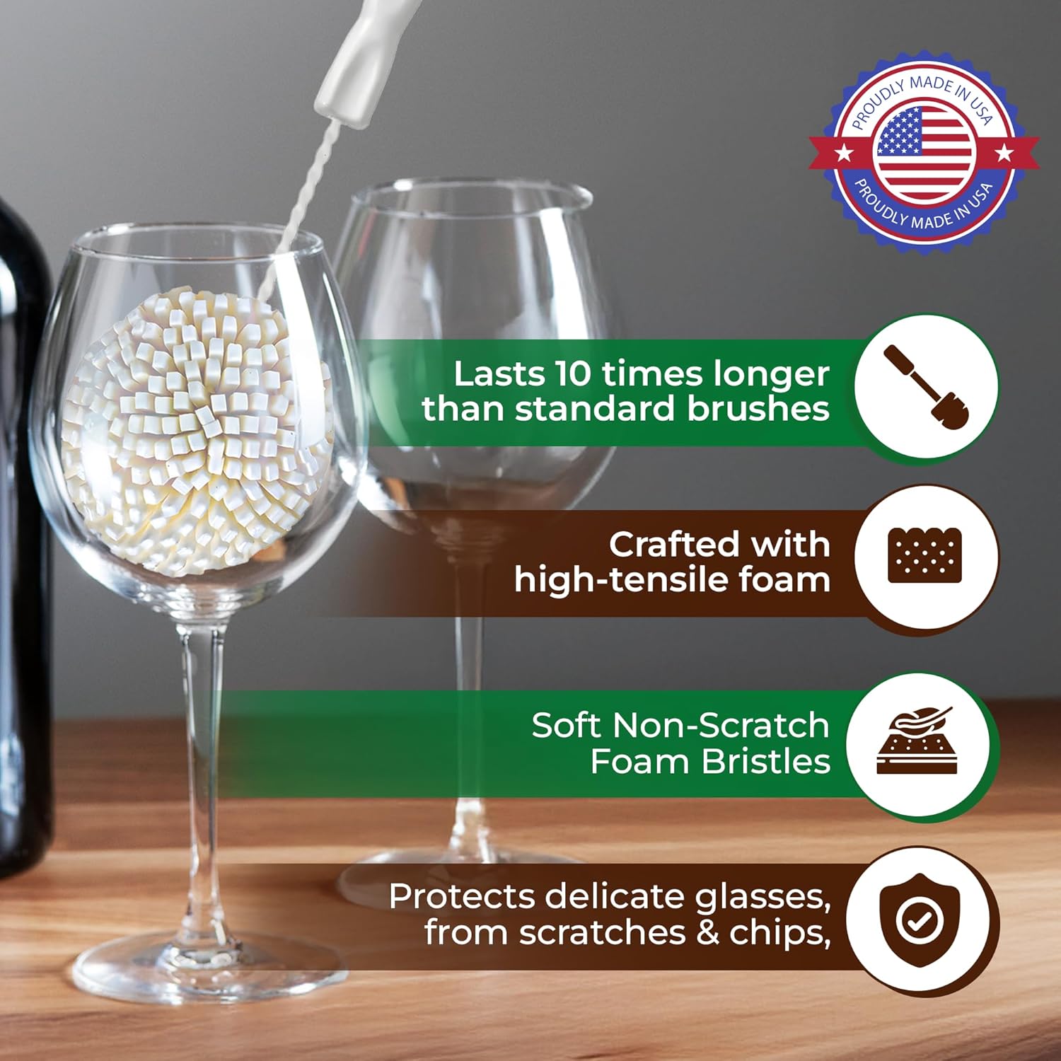 - SOFT NON-SCRATCH FOAM BRISTLES - This wine glass cleaner brush is designed with soft non-scratch foam bristles that ensures a gentle touch that protects delicate crystal glasses, champagne goblet, and stemware from scratches, chips, or marks.