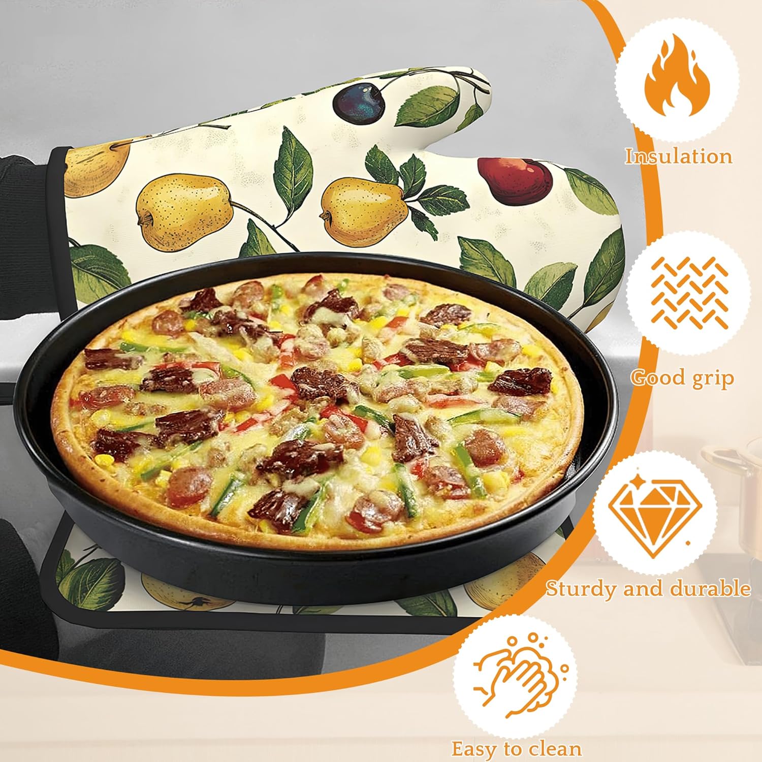 Retro Fruit Oven Mitts and Pot Holders Set,Cherry Kitchen Oven Gloves and Pot Holder with Heat Resistant Non Slip for Cooking Baking Grilling(4 Piece Set)