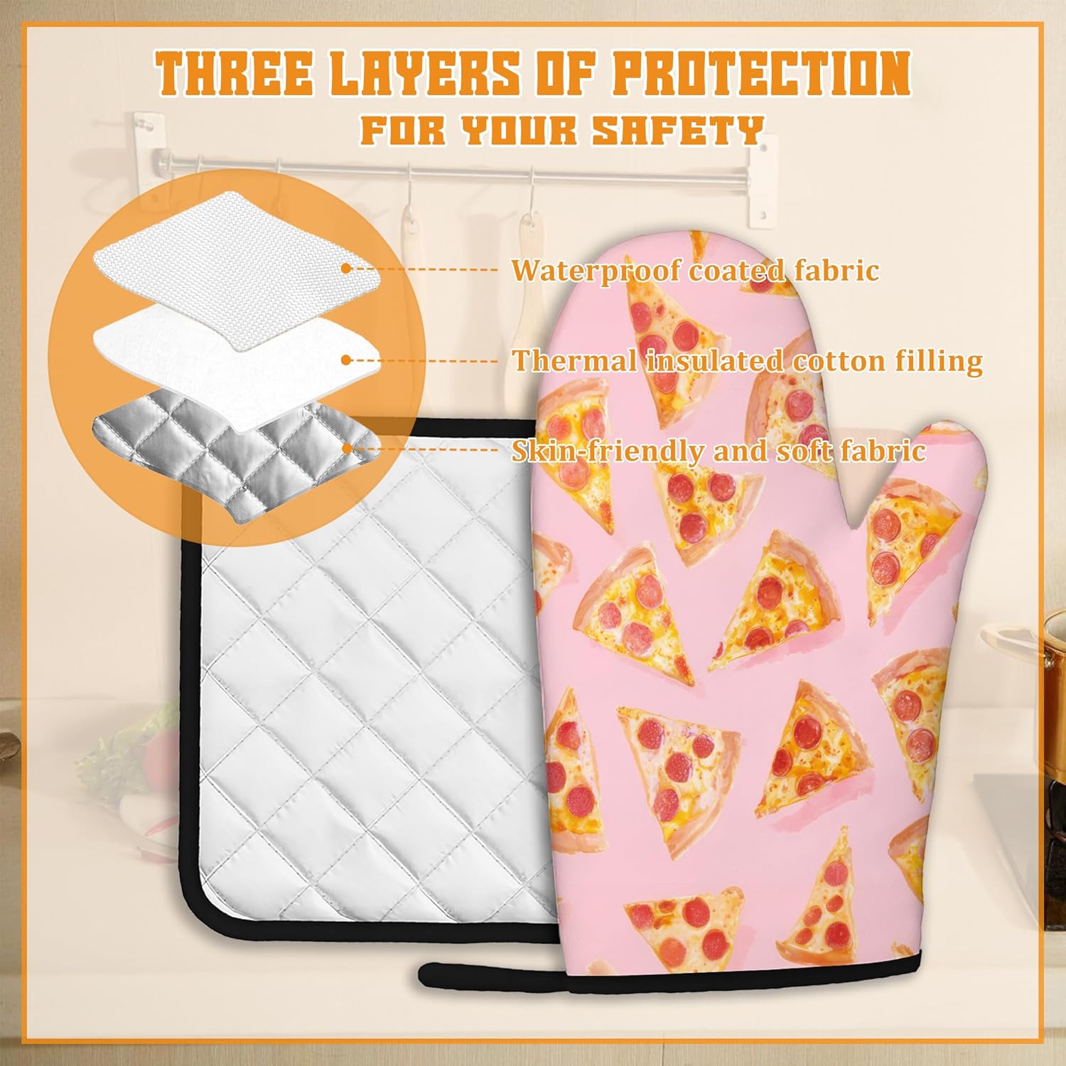 Cute Pizza Oven Mitts and Pot Holders,Heat Resistant Oven Mitts Gloves and Pot Holder for Home Kitchen Decorations Cooking Baking BBQ Gifts,Set of 4