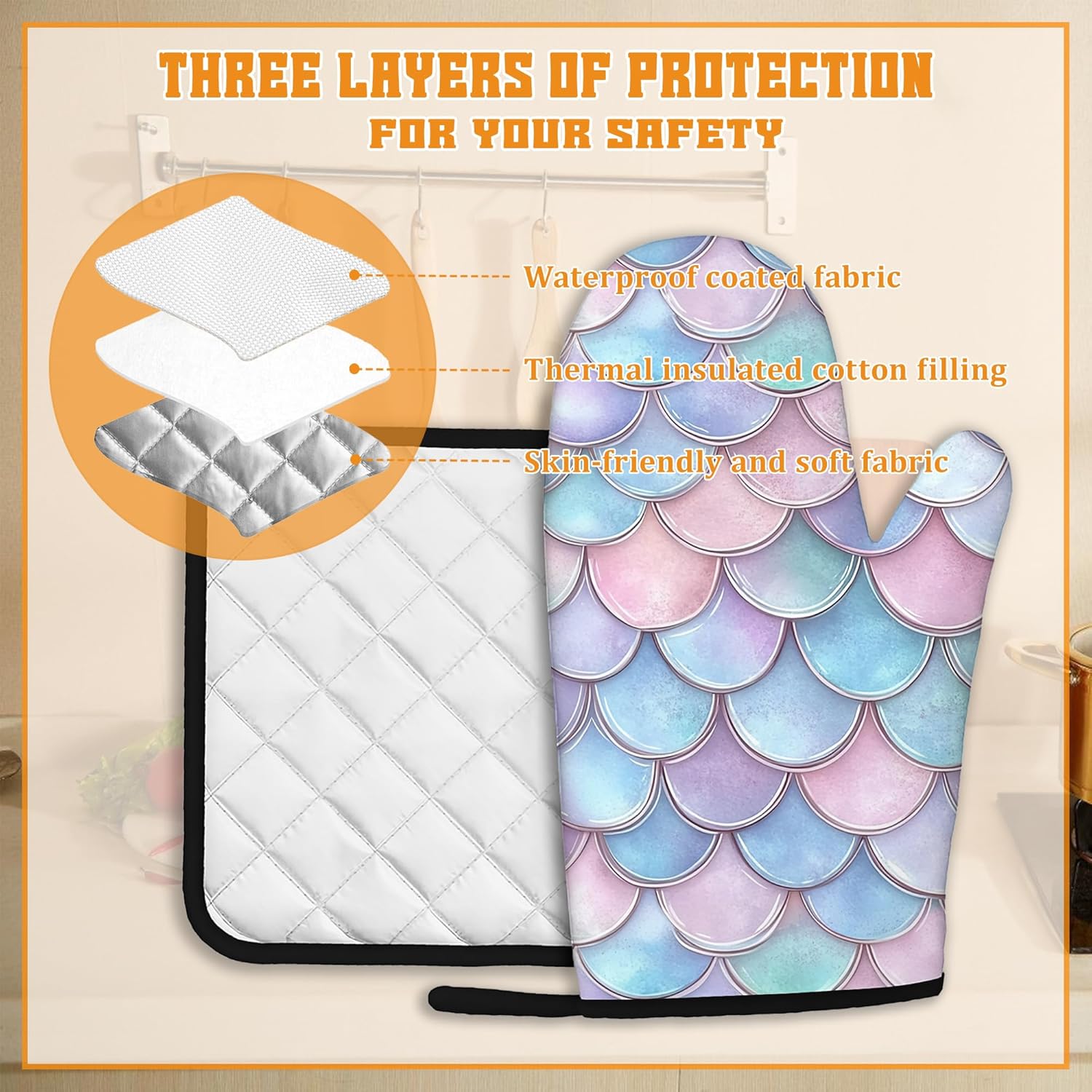Pink Fish Scales Oven Mitts and Pot Holders Set,Mermaids Kitchen Decor Heat Resistant Non Slip Hot Pads and Oven Mitt for Chef Cooking Baking BBQ Mom Girl Gifts(4 Piece Set)