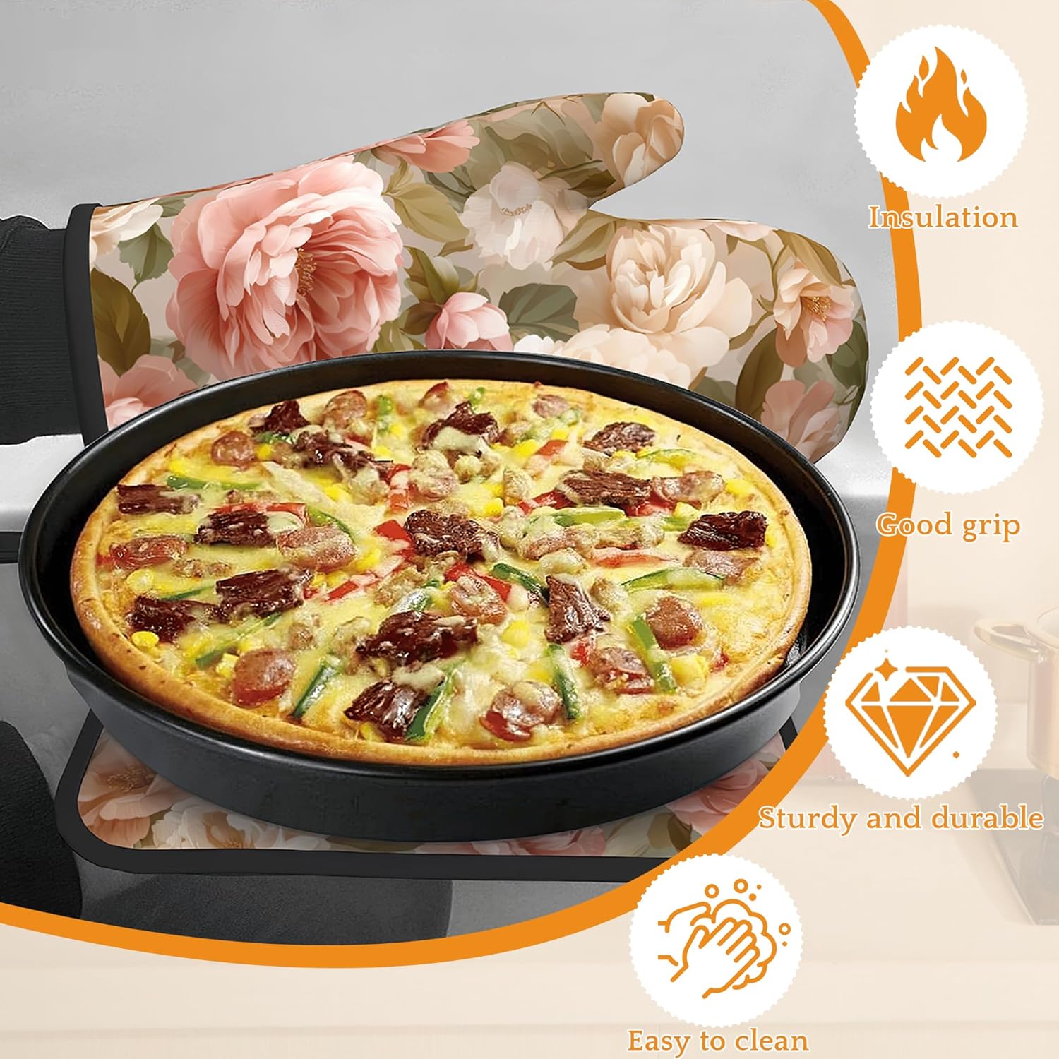 Pink Roses Oven Mitts and Pot Holders Set,Peony Flower Kitchen Oven Gloves and Pot Holder with Heat Resistant Non Slip for Cooking Baking Grilling(4 Piece Set)