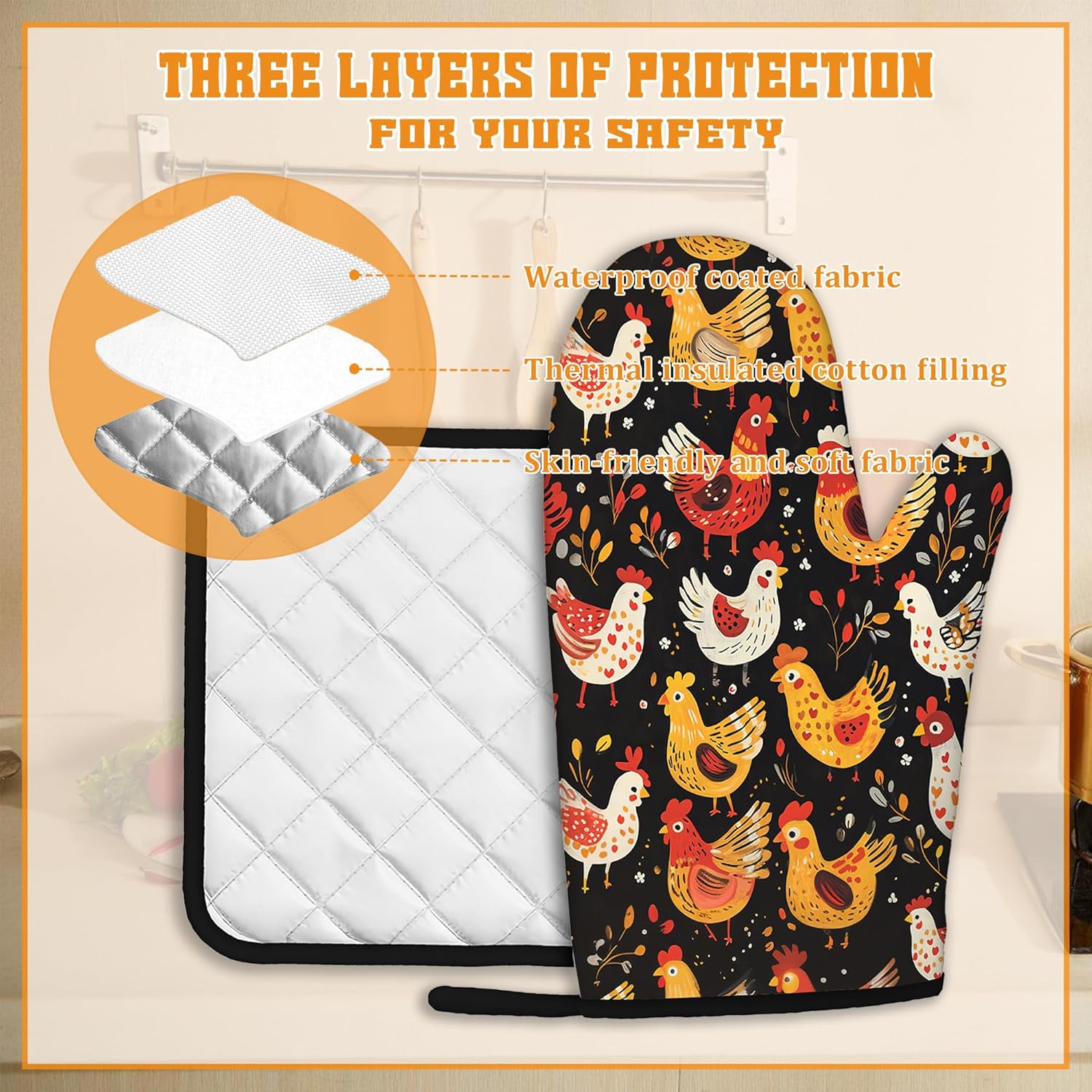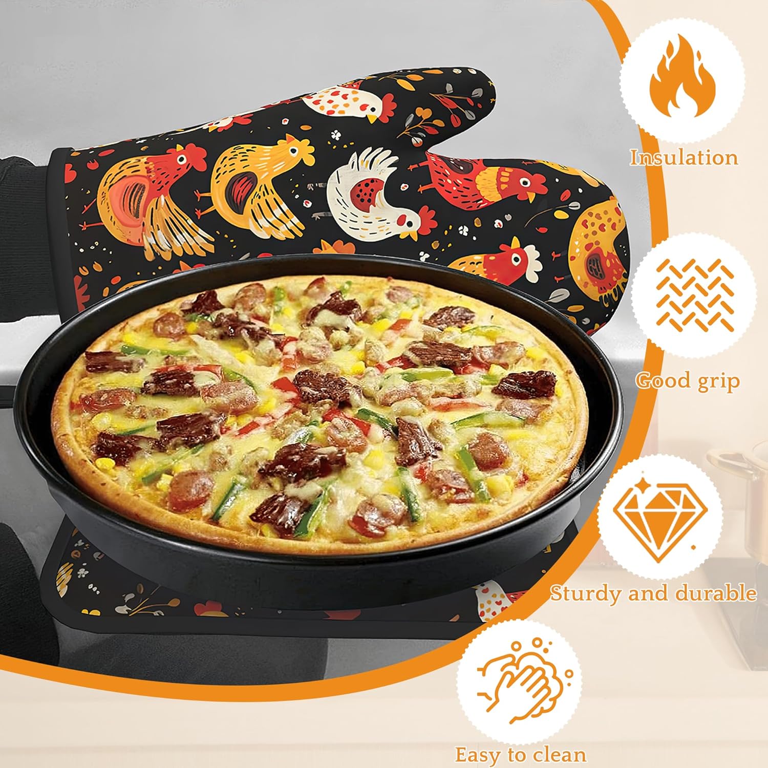 Colorful Rooster Oven Mitts and Pot Holders,Cute Chicken Heat Resistant Oven Mitts Gloves and Pot Holder for Home Kitchen Decorations Cooking Baking BBQ Gifts,Set of 4