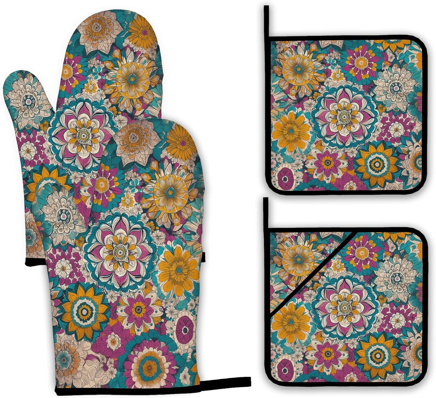 Vintage Mandala Oven Mitts and Pot Holders,Floral Flower Heat Resistant Oven Mitts Gloves and Pot Holder for Home Kitchen Decorations Cooking Baking BBQ Gifts,Set of 4