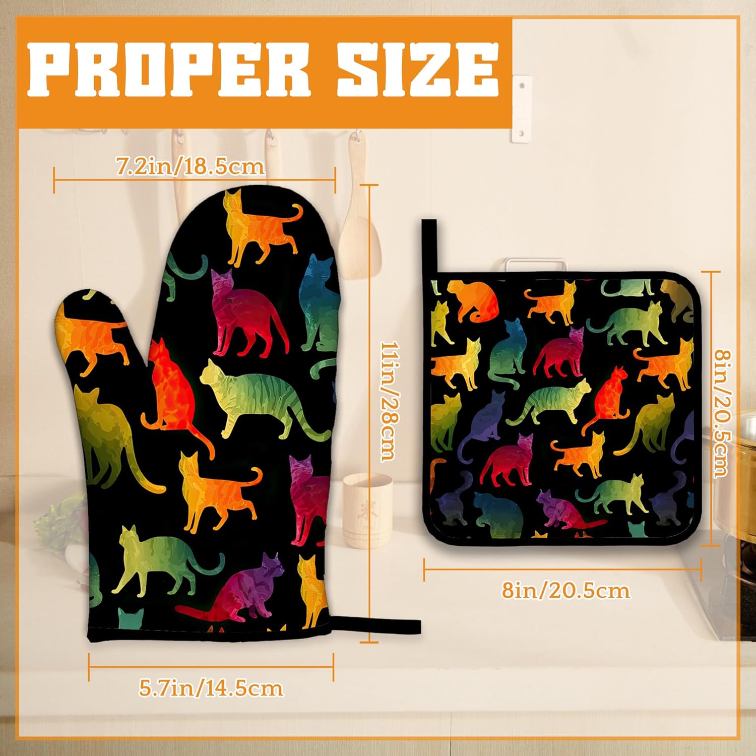 Funny Colorful Cat Oven Mitts and Pot Holders Set,Kitchen Decor Heat Resistant Non Slip Hot Pads and Oven Mitt for Chef Cooking Baking BBQ Mom Girl Gifts(4 Piece Set)