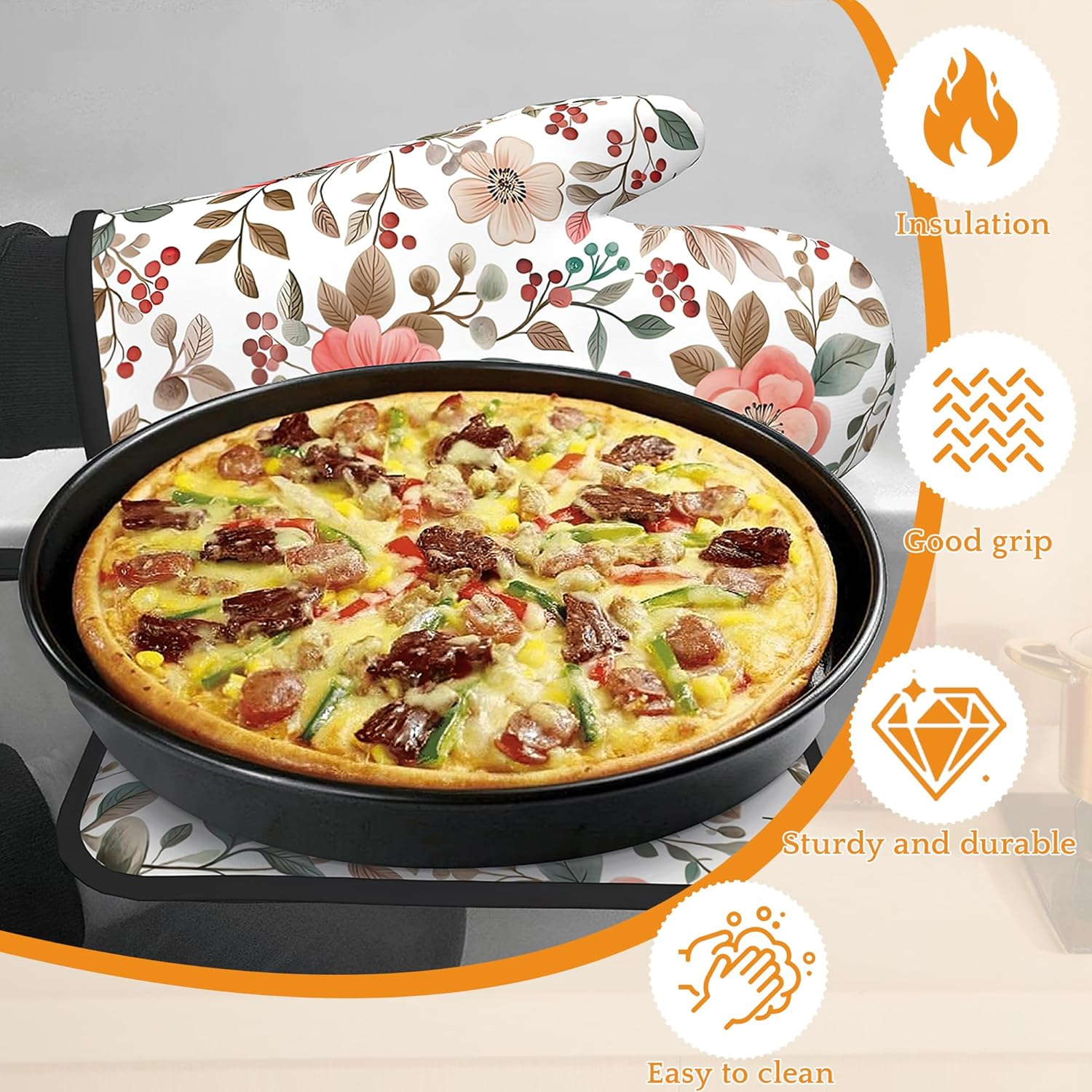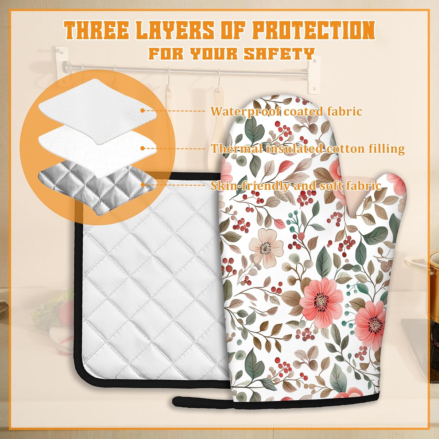Pink Poppy Floral Oven Mitts and Pot Holders Set,Berry Kitchen Decor Heat Resistant Non Slip Hot Pads and Oven Mitt for Chef Cooking Baking BBQ Mom Girl Gifts(4 Piece Set)