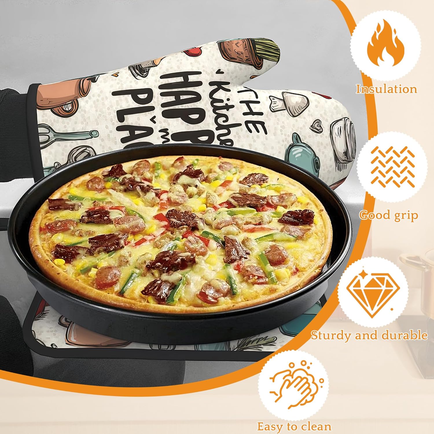 Oven Mitts and Pot Holders,The Kitchen is My Happy Place Heat Resistant Oven Mitts Gloves and Pot Holder for Home Kitchen Decorations Cooking Baking BBQ Gifts,Set of 4