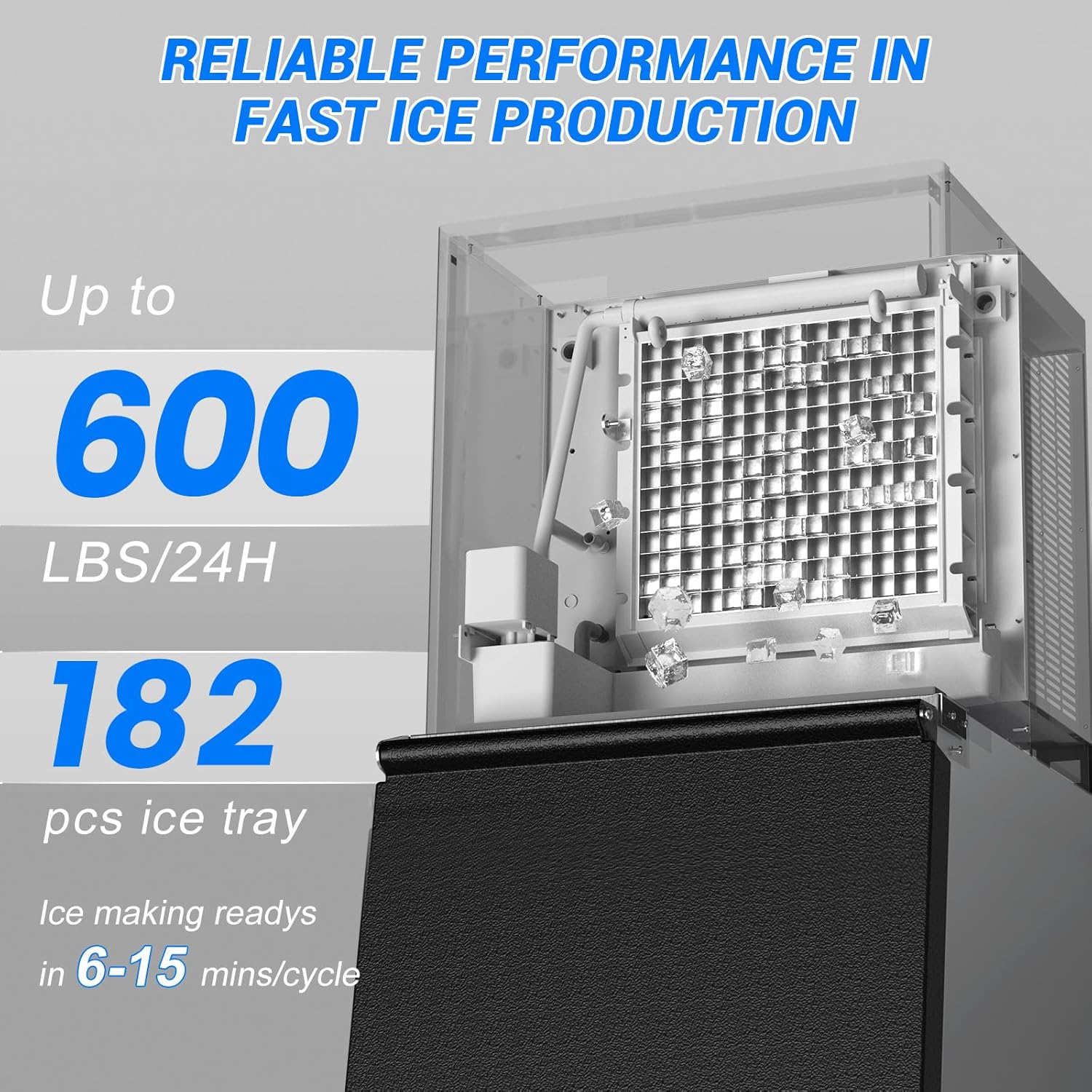 - Rapid Freezing with Efficient Compressor - Equipped with a powerful and energy-efficient compressor, this machine ensures fast and continuous ice production. Ice forms in as little as 6–15 minutes per cycle, maximizing productivity and minimizing wait times.