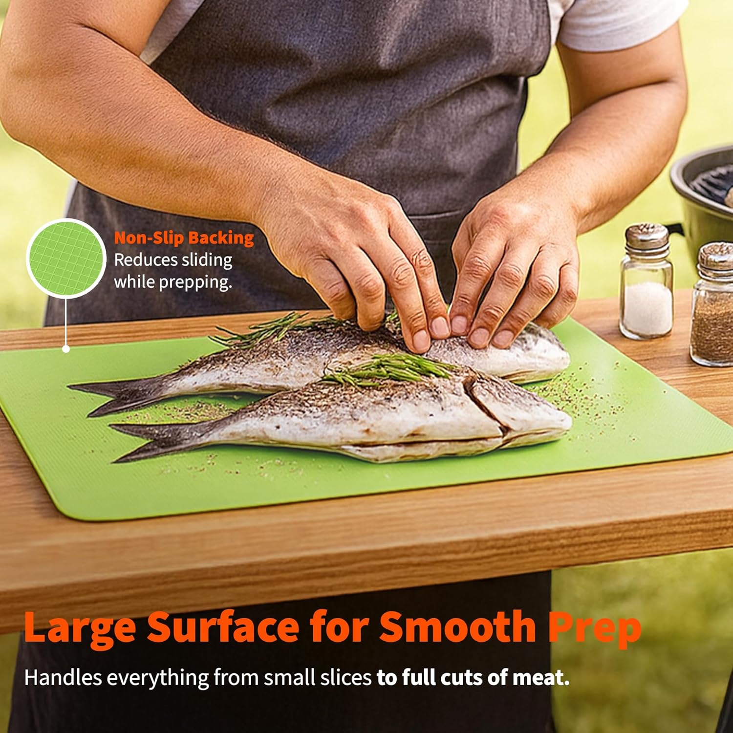 - STORE WITH EASE – Slim, flexible, and lightweight, each cutting board mat nests flat for compact storage; a smart solution for small kitchens, college apartment essentials, or RV setups—eliminating bulky cutting board clutter in drawers or cabinets.