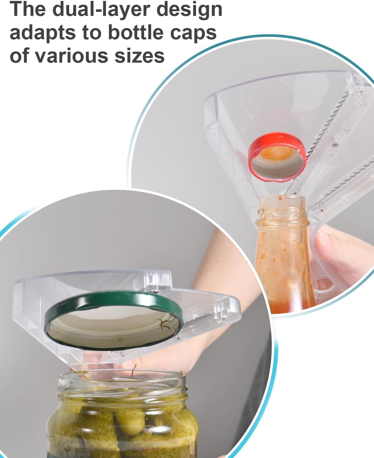 - 💖Multi-Purpose: This jar opener features a double-layer design, suitable for bottle caps of different sizes. The jar opener can open lids up to 5 inches wide and as small as drink bottle caps, making it an excellent kitchen accessory
