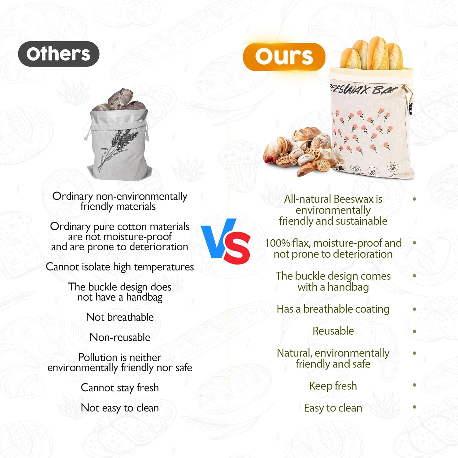 - All Natural Beeswax Blend for Long-Lasting Freshness -Beeswax Bread Bags Crafted with a blend of natural beeswax, jojoba oil, and tree resin, these 100% Linen Moisture-proof Lined bags lock in moisture to keep bread soft and flavorful. Ideal for storing sourdough, bagels, or baked goods in the freezer or refrigerator. Lightweight and portable,Designed to accommodate both small and large loaves—perfect for home, picnics, and travel
