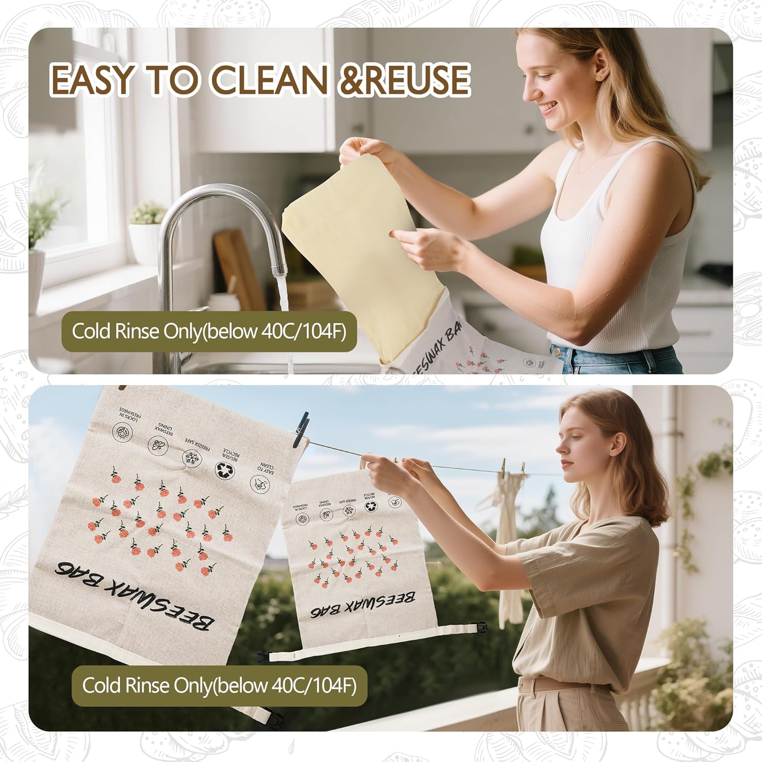 - Easy to Clean & Reusable: Our reusable bread bags for homemade bread feature pull-out and beeswax linings—rinse with cool water only (below 40°C/104°F), as heat melts natural beeswax. After rinsing and air-drying in the shade, they are ready to reuse as a greener alternative to disposable bags, acting as a long - lasting alternative to traditional disposable bread storage solutions and a sustainable version of a bread bag.