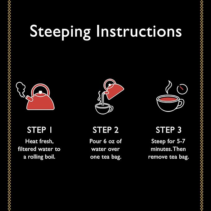 - To Steep The Perfect Cup: Heat 6 oz of fresh, filtered water to boiling. Place one tea bag in your cup, pour in the hot water and steep for 5-7 minutes.