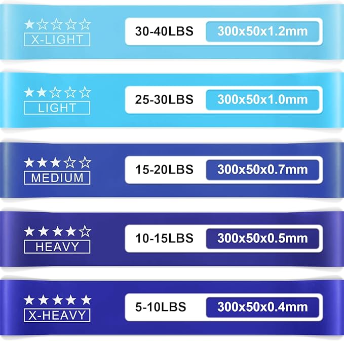 - 5 Level Resistance Band Set:The 5 different colors of the exercise bands different resistance levels and have been optimized and upgraded to increase their thickness compared to the more common resistance bands for legs, with weights ranging from 10lbs to 115lbs when used in combination. Whether you are a beginner or an experienced fitness enthusiast, we have the right weight level for you, which will make this set of fitness band resistance bands your ideal workout companion.