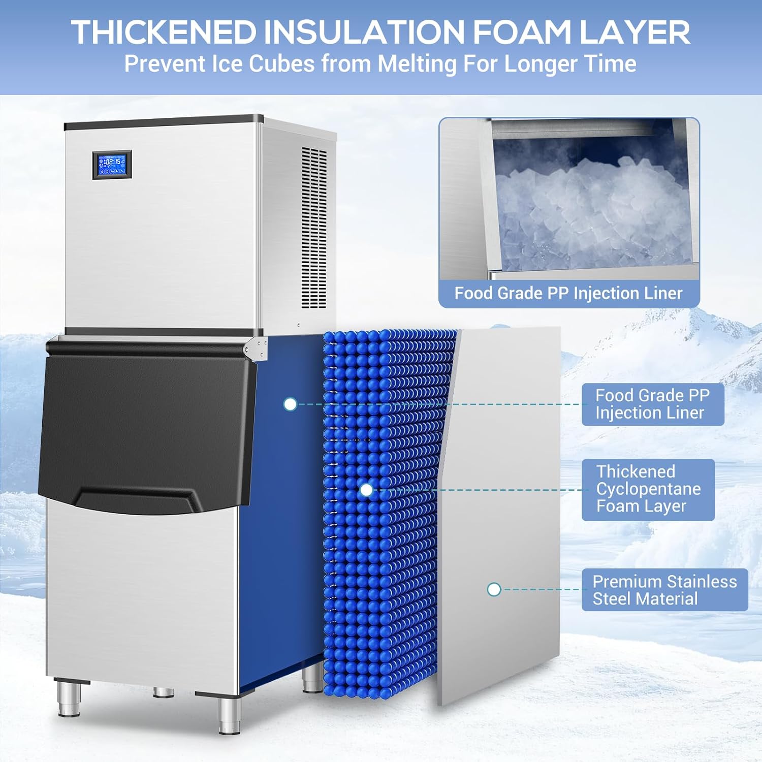 - Durable Construction: Made of heavy-duty brushed stainless steel, our split ice maker has premium rust-resistant features and is more durable for better longevity, which ensures that it can withstand the demands of commercial use. The ice storage bin is composed of a food-grade PP injection liner and a thickened cyclopentane foam layer, which not only has strong impact resistance but also effectively isolates external heat to protect the ice from melting for a longer time