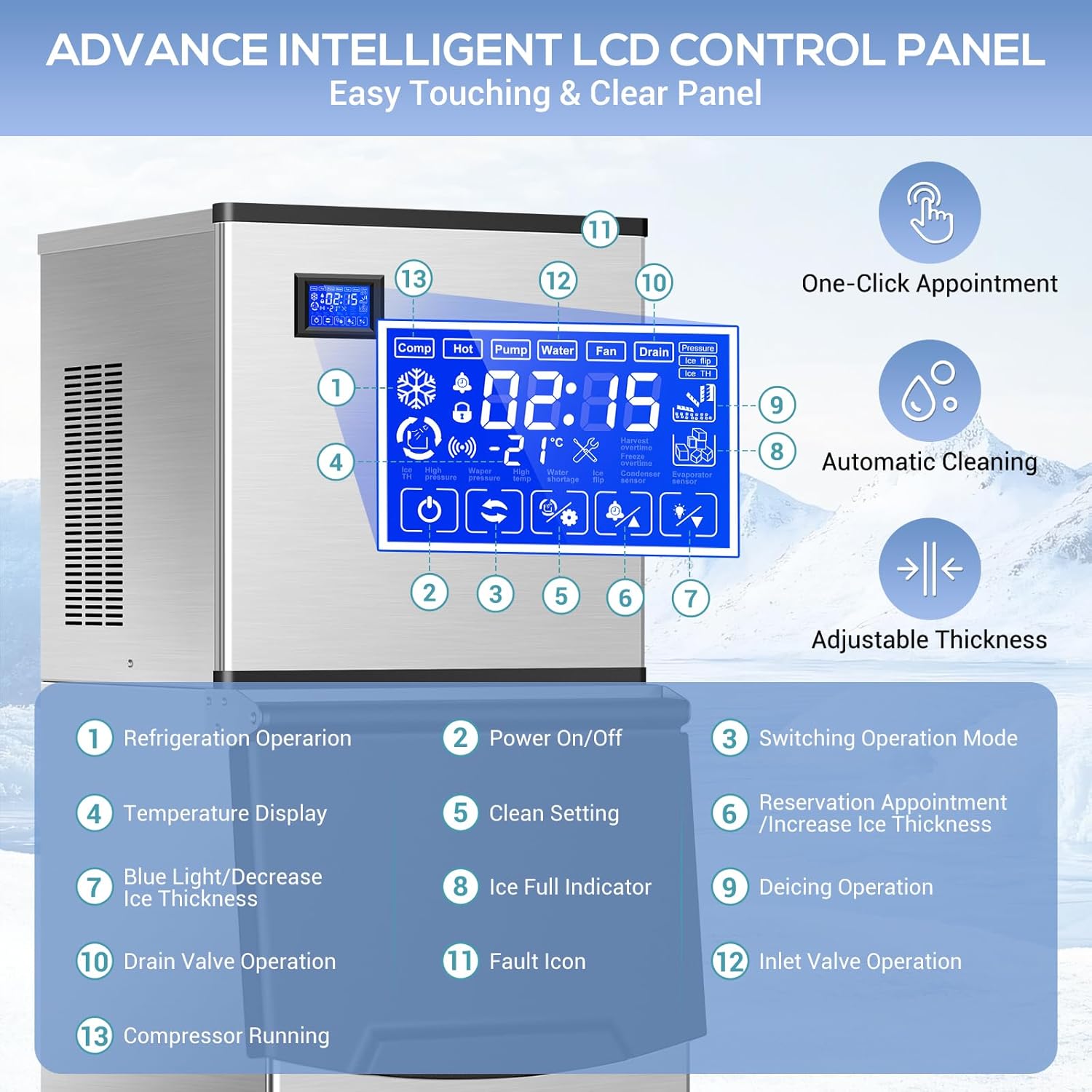 - User-Friendly LCD Digital Panel: The ice maker machine features an easy-to-use, touch-sensitive LCD panel that displays the ice-making process clearly and continuously monitors the ice-making status. The intelligent panel allows you to easily select the ice-making time and thickness, with a range of functions including a 1-24 hour timer, full-ice reminder, and automatic cleaning. (NOTE: Keep the ice machine upright for 24h before first use.)