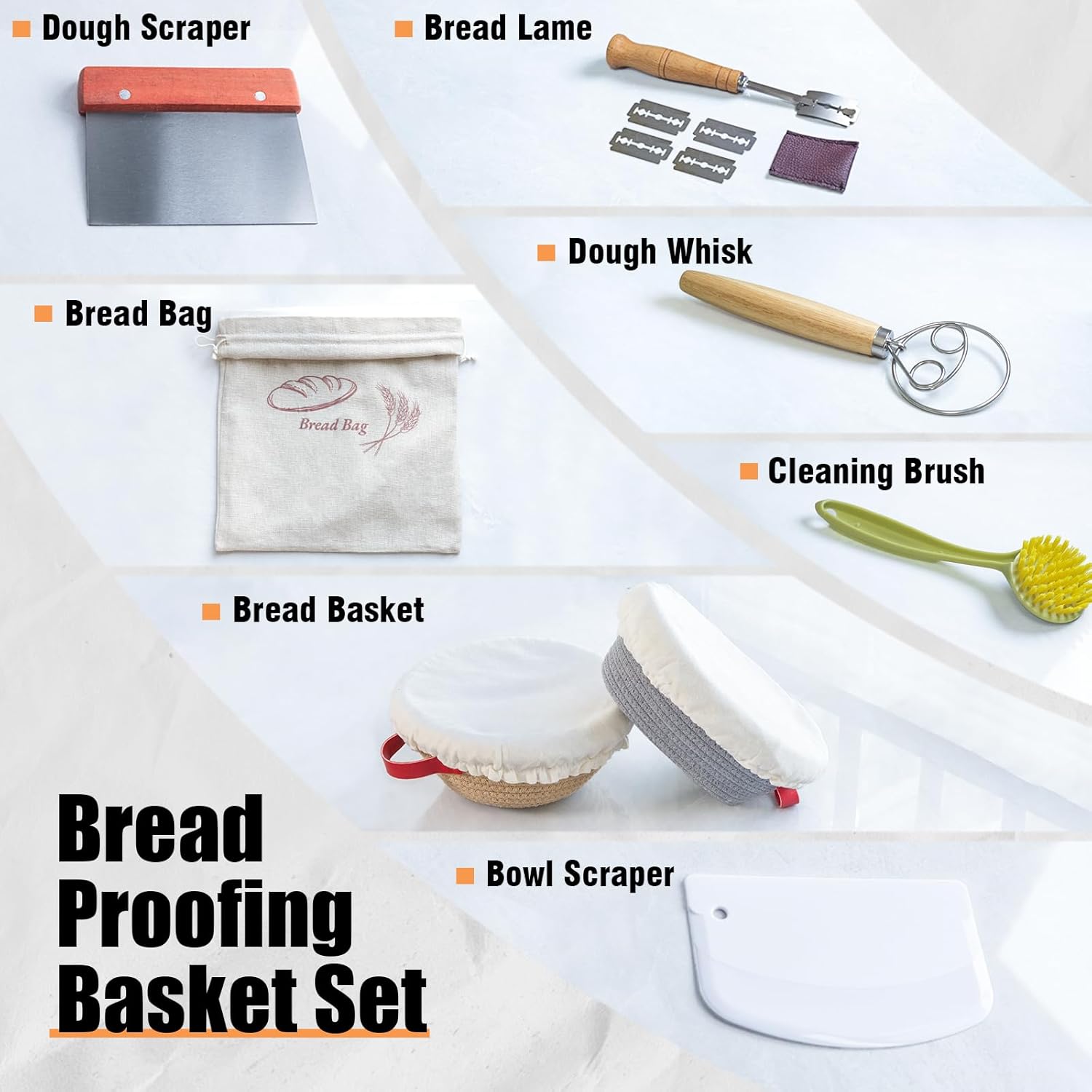 - All-in-one: Including 7.5-inch round & 7.5-inch oval proofing basket, a reusable bread storage bag, a scoring lame for artisan-style designs, a dough scraper and bowl scraper for dough manipulation, a dough whisk for thorough mixing, a cleaning brush for flour removal