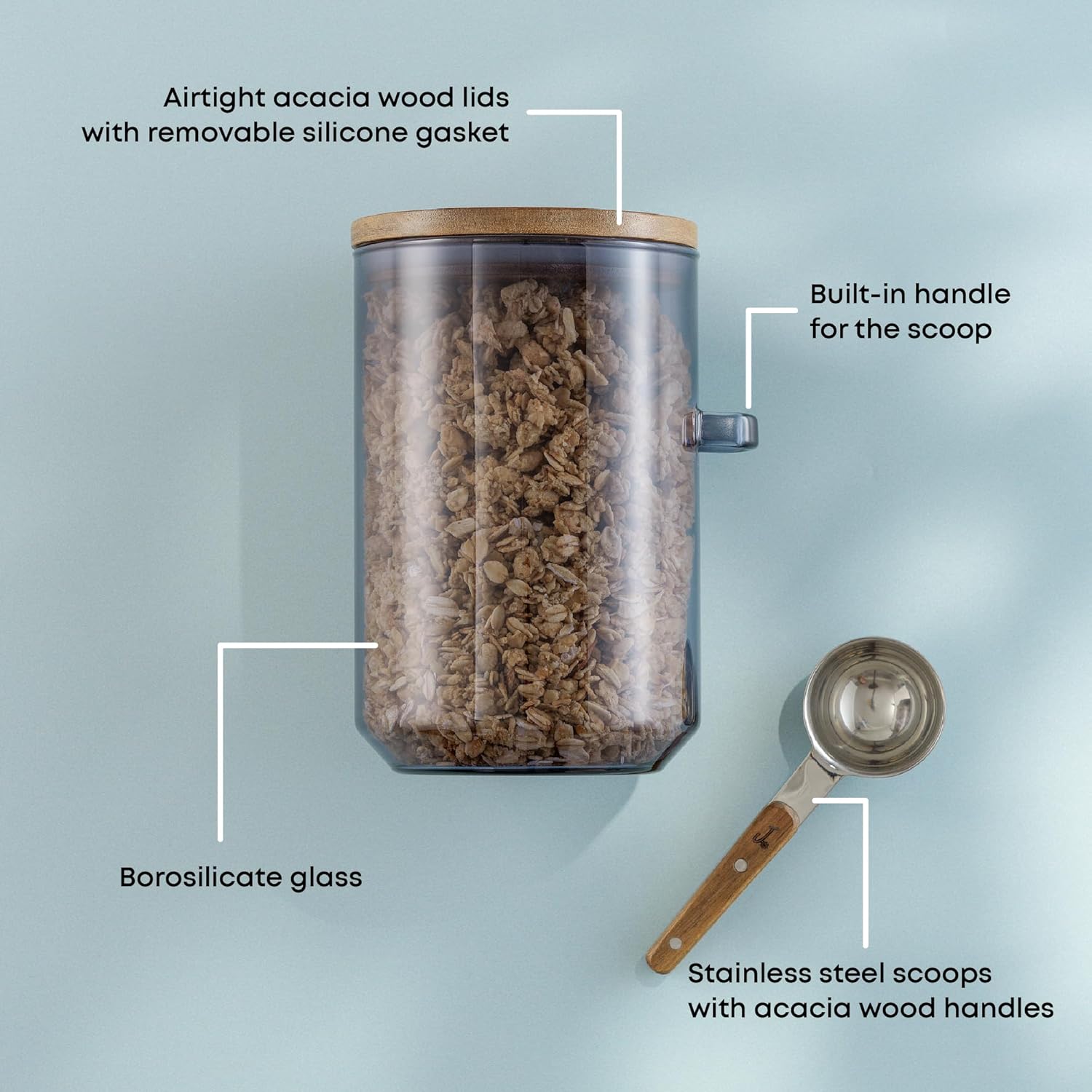 JoyJolt Holden 32oz Stackable Glass Storage Containers with Lids and Scoops, Airtight Food Canister Set of 3 w/Acacia Wood Lids, Round Stacking Pantry and Kitchen Containers w/Scoop | Smoke Blue