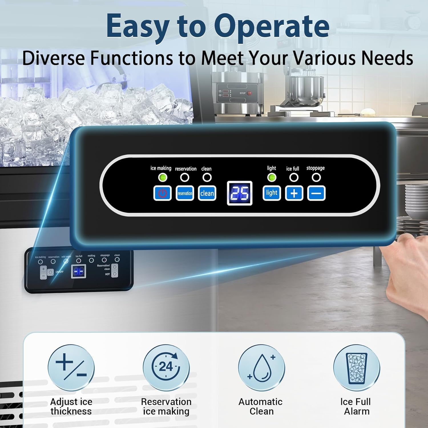 - Smart Control Panel & Self-Cleaning Function. Boasting an intuitive LCD control panel, this ice maker simplifies operation with features like automated cleaning, defrosting, scheduling, and fault notifications. Effortlessly customize ice production time and cube thickness using the (+) and (-) buttons. The auto-clean functionality ensures effortless upkeep, minimizing maintenance hassles.