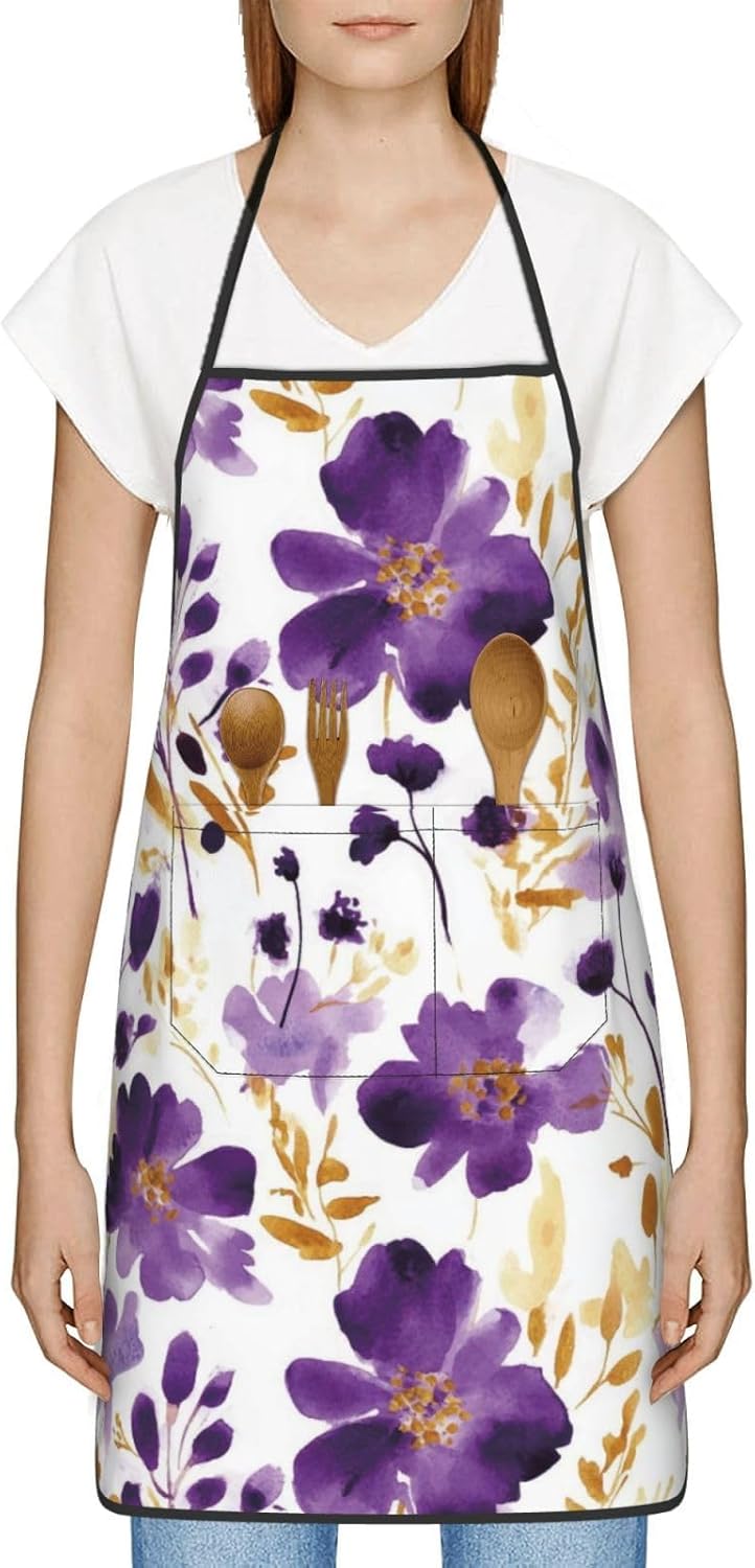 - Versatile Scenarios: Perfect for a wide range of activities including cooking delicious meals in the kitchen, hosting BBQs, baking treats, painting, gardening, and more. This purple and gold watercolor floral chef apron is a great choice for both home cooks and those who love to entertain